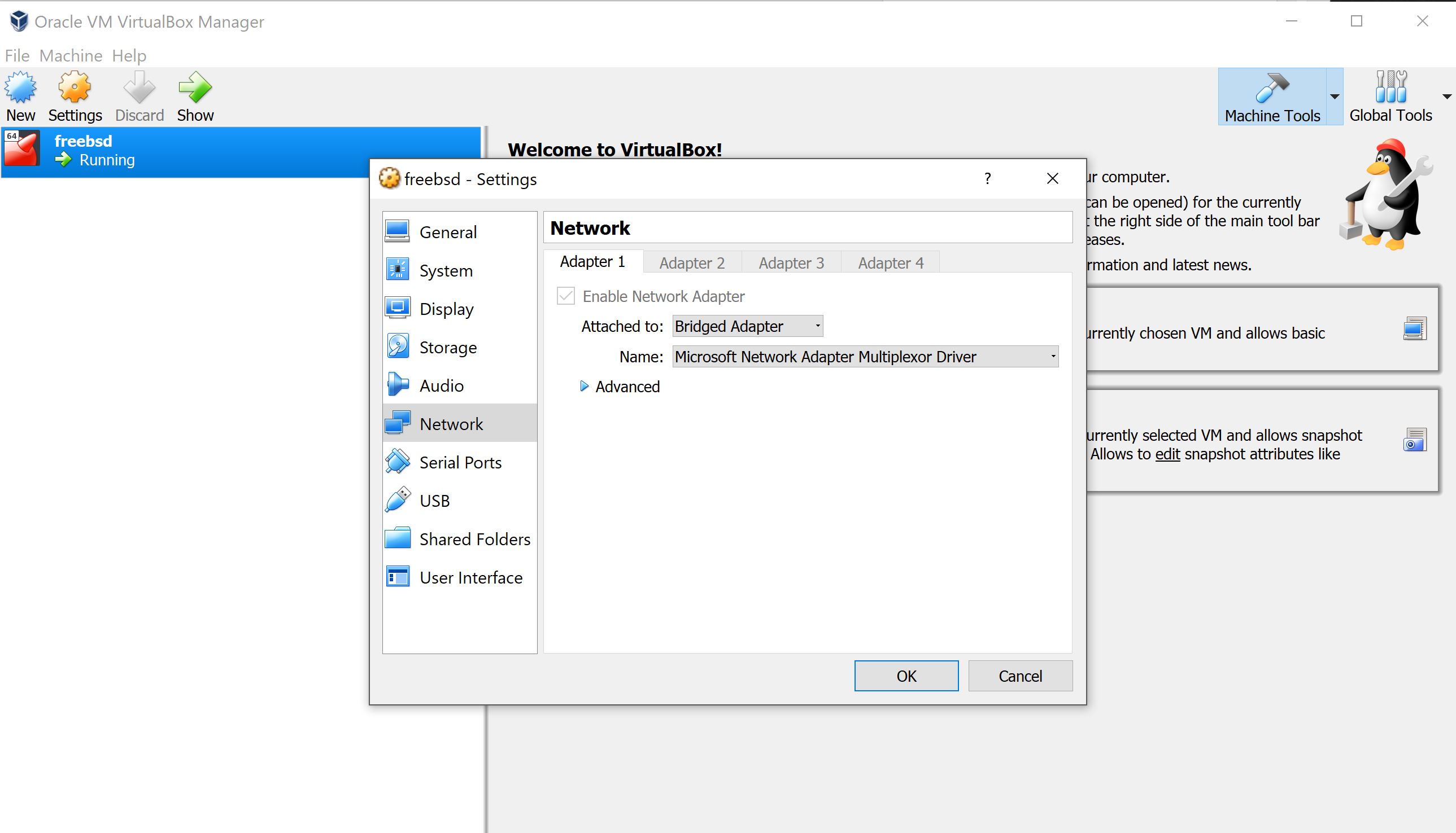 This is an overview of the process. During my initial exercise, “Enable hardware virtualization” did not happen until it was discovered disabled. The primary scope of this post is to describe the overall tasks necessary to install FreeBSD as a guest and enable networking. It starts at creating a VM in VirtualBox. Also described will be challenges regarding networking the FreeBSD guest over a wireless bridge.