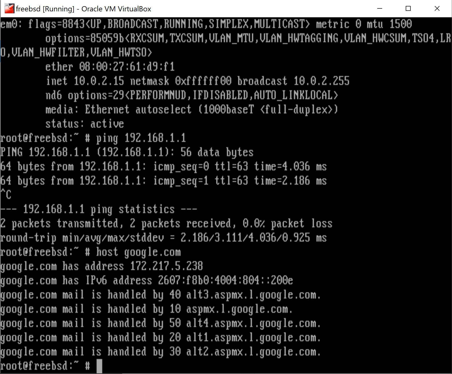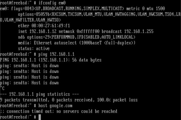 Observe the results below. Note em0 receives its IP address, but networking doesn’t seem to work as illustrated by the “Host is down” message when the defaultrouter is pinged. Additionally, host(1) fails to return the desired result…successful lookups.