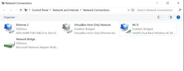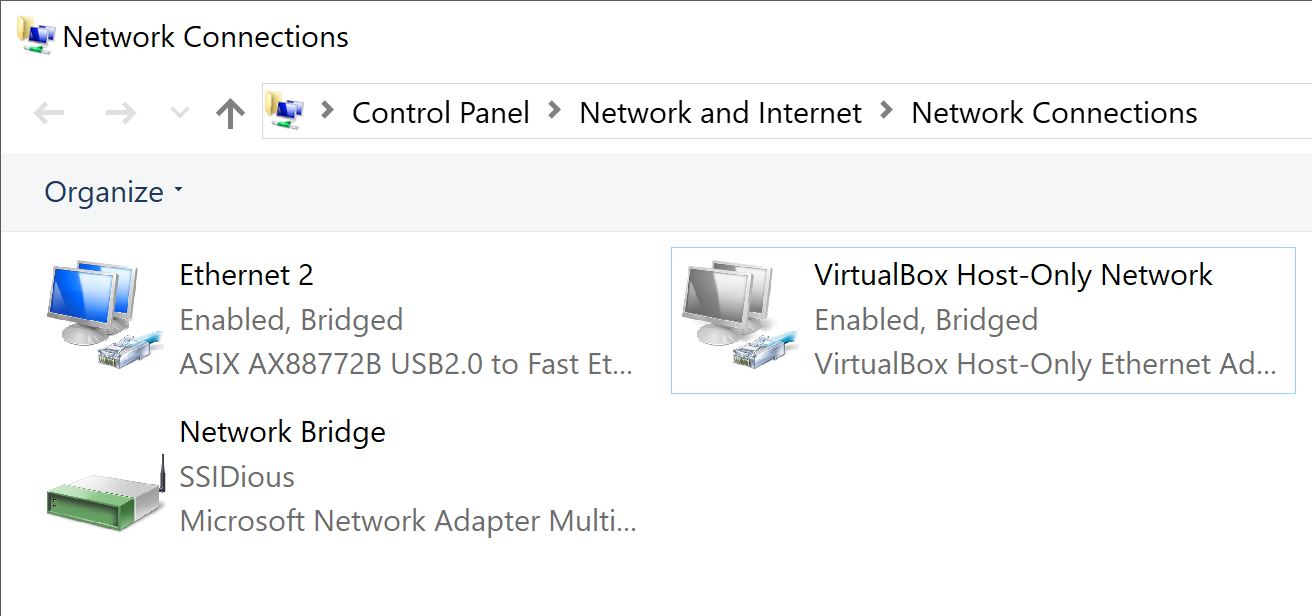 The Wi-Fi and VirtualBox Host-Only Networks are bridged by selecting both simultaneously, right clicking, and selecting “Bridge Connections”. A new connection showed up: